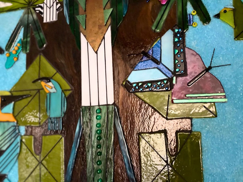The design was inspired by a poster by Charley Harper 'Monteverde Cloud Forest'. I incorporated fused glass elements, adding a rich tapestry of texture to the intricate design. The backdrop, crafted from glass frit, serves as a mesmerizing canvas, capturing the essence of Harper's timeless masterpiece.